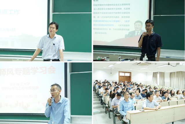為全面貫徹習(xí)近平總書(shū)記關(guān)于教育的重要論述和全國(guó)教育大會(huì)精神,深入學(xué)習(xí)師德師風(fēng)建設(shè)系列文件精神,進(jìn)一步加強(qiáng)師德師風(fēng)建設(shè),6月4日,材料學(xué)院在四教102召開(kāi)2021年師德師風(fēng)專(zhuān)題學(xué)習(xí)會(huì)。學(xué)院黨政班子成員、全體教師參加會(huì)議,會(huì)議由副院長(zhǎng)顧金樓主持。