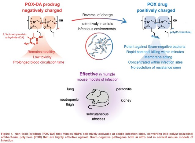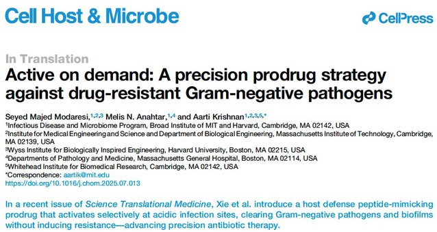 該研究報道了一種感染部位原位激活的宿主防御肽模擬前藥設(shè)計策略,在實現(xiàn)“生理環(huán)境隱形、感染部位激活”響應(yīng)性精準抗感染治療的同時,還可將原本因毒性和生物利用度等問題受限的多肽類化合物轉(zhuǎn)化為安全有效的候選藥物分子,為開發(fā)具有體內(nèi)應(yīng)用潛力的新型抗感染藥物提供了新思路。研究成果以“A host defense peptide-mimicking prodrug activated by drug-resistant Gram-negative bacterial infections”為題,以封面文章發(fā)表在ScienceTranslational Medicine(Sci. Transl. Med.2025, 17, 801, eadl4870)。該研究成果最近還被Nature Reviews Drug Discovery作為研究亮點報道(https://doi.org/10.1038/d41573-025-00118-7)。